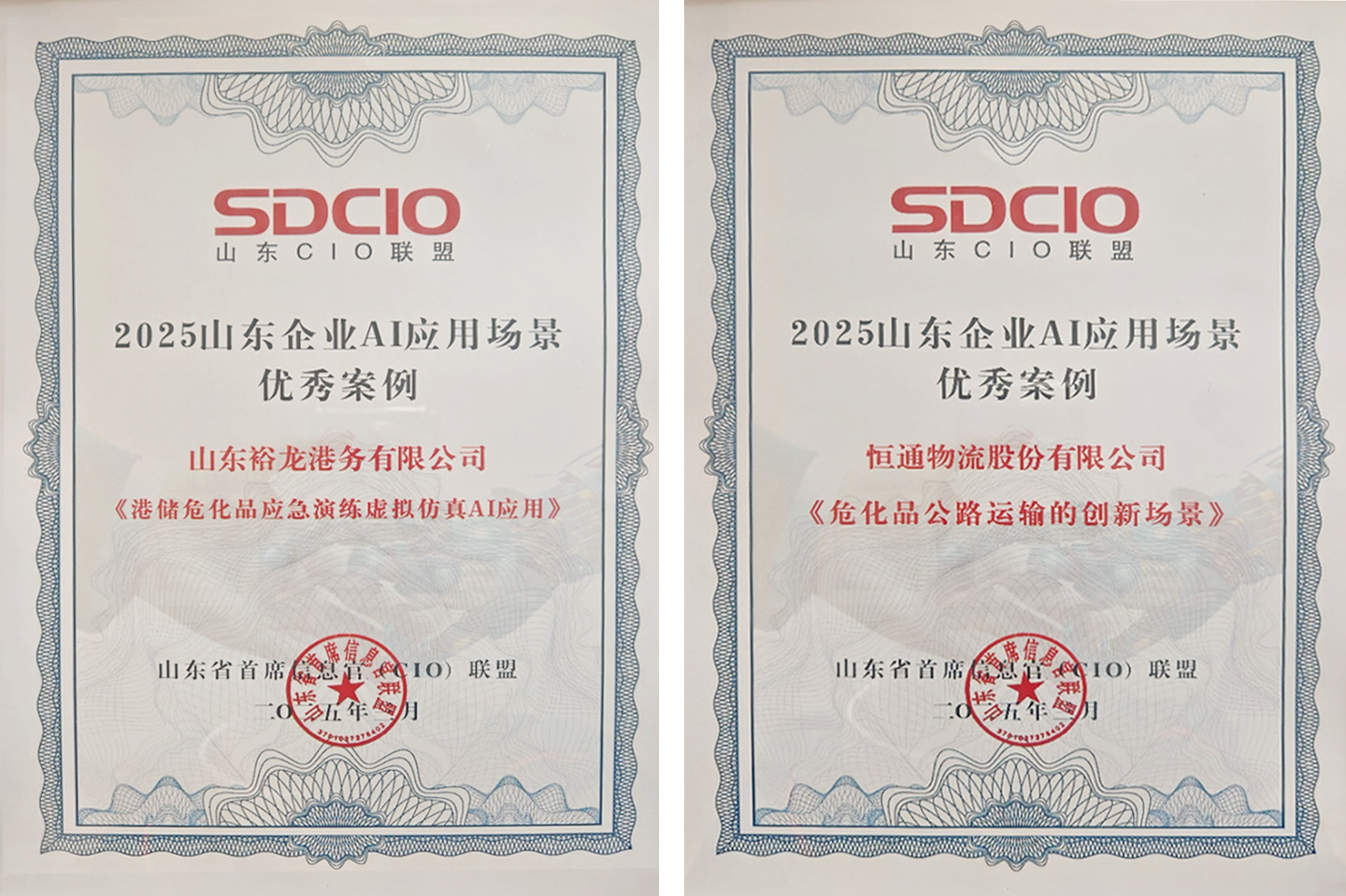 3月15日,在山東CIO聯(lián)盟舉辦的2025山東企業(yè)數(shù)智化創(chuàng)新應(yīng)用峰會中,恒通物流股份有限公司申報的“危化品公路運輸?shù)膭?chuàng)新場景”、山東裕龍港務(wù)有限公司申報的“港儲?;窇?yīng)急演練虛擬仿真AI應(yīng)用”榮獲山東企業(yè)AI應(yīng)用場景優(yōu)秀案例獎。